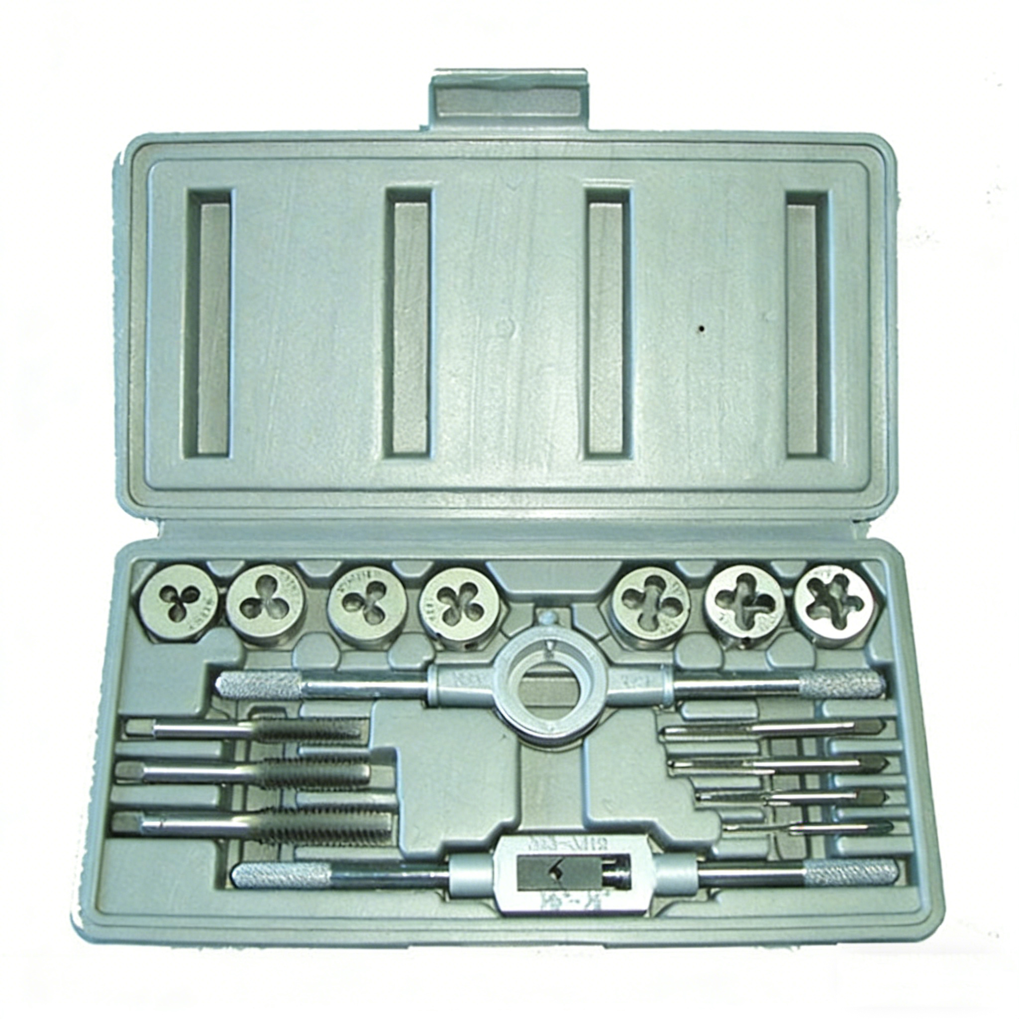 METRIC7PC Dies size:M3×0.5, M4×0.7, M5×0.8, M6×1.0, M8×1.25, M10×1.5, M12×1.757PC Taps:same size as dieDie handle:1"OD1PC Tap Wrench M3-M12SAE7PC Taps size:6-32, 8-32, 1/4-20, 5/16-18, 3/8-16, 7/
